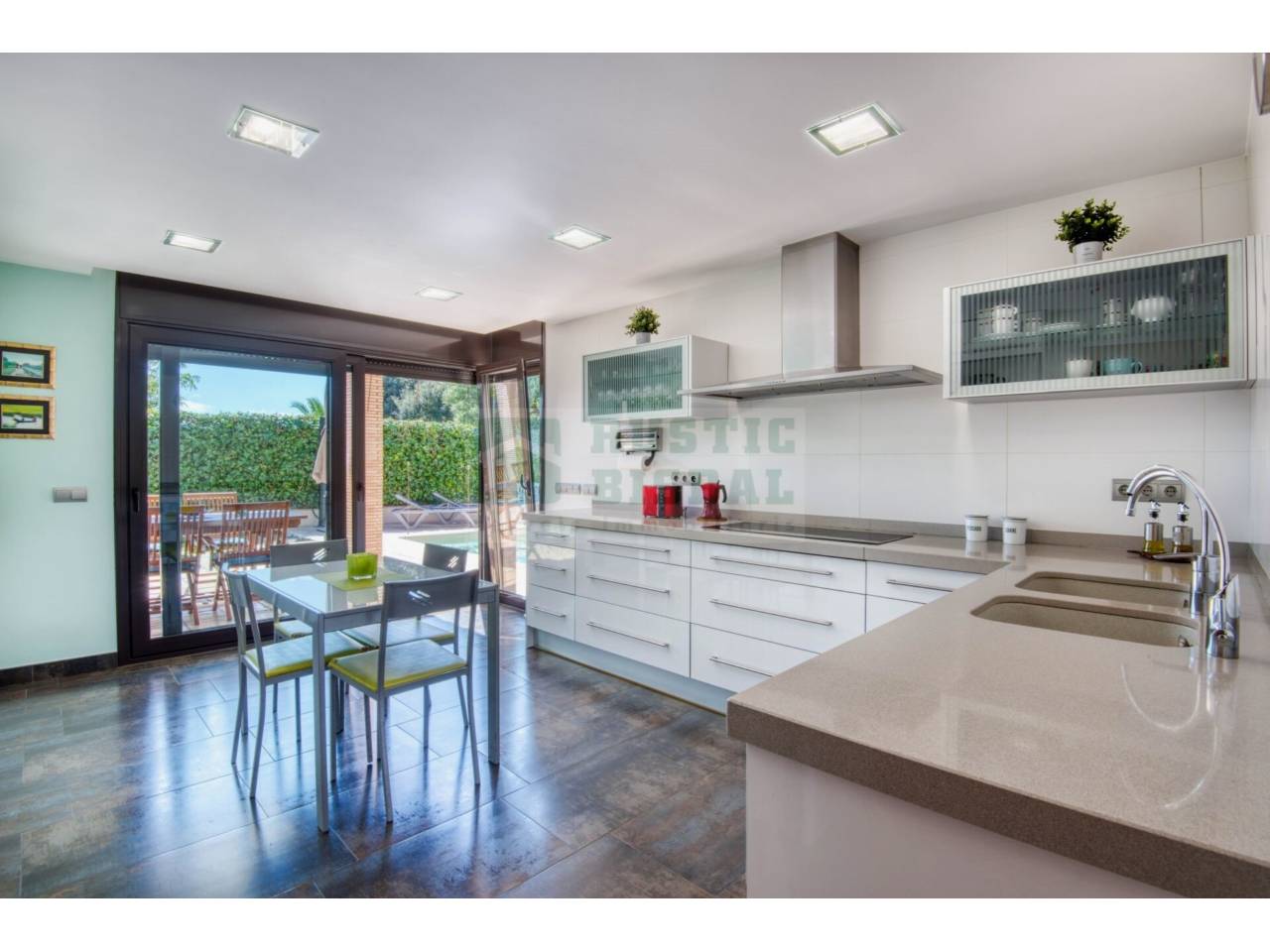 La zona de día reúne un gran salón–comedor con chimenea y salida al porche, perfecto para disfrutar del exterior durante todo el año. La cocina tipo office, espaciosa y práctica, invita a la vida familiar y cotidiana con total confort.