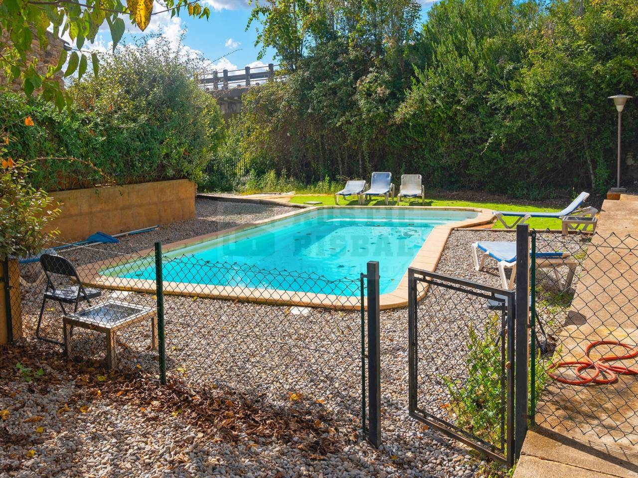 La vivienda principal, que ocupa el antiguo molino, se desarrolla en planta baja y dos niveles, manteniendo muchos de los acabados originales del siglo XVIII: suelos de época, vigas de madera, piedra natural y distribuciones tradicionales que aportan un carácter único. Dispone de amplios espacios interiores, chimenea, calefacción a gasoil y acceso directo a una piscina privada rodeada de jardín y zonas de descanso. La finca cuenta además con un amplio garaje con capacidad para tres coches, así como zona de aparcamiento exterior para varios vehículos adicionales.
